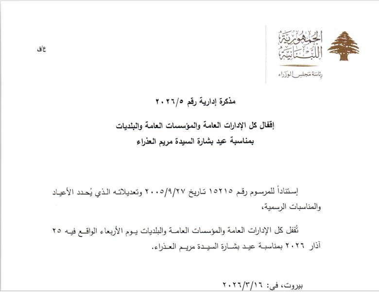 أصدرت رئاسة مجلس الوزراء مذكرين إداريتين تقضيان بإقفال كل الإدارات العامة والمؤسسات العامة والبلديات لمناسبة عيد الفطر المبارك وعيد بشارة السيدة مريم.
