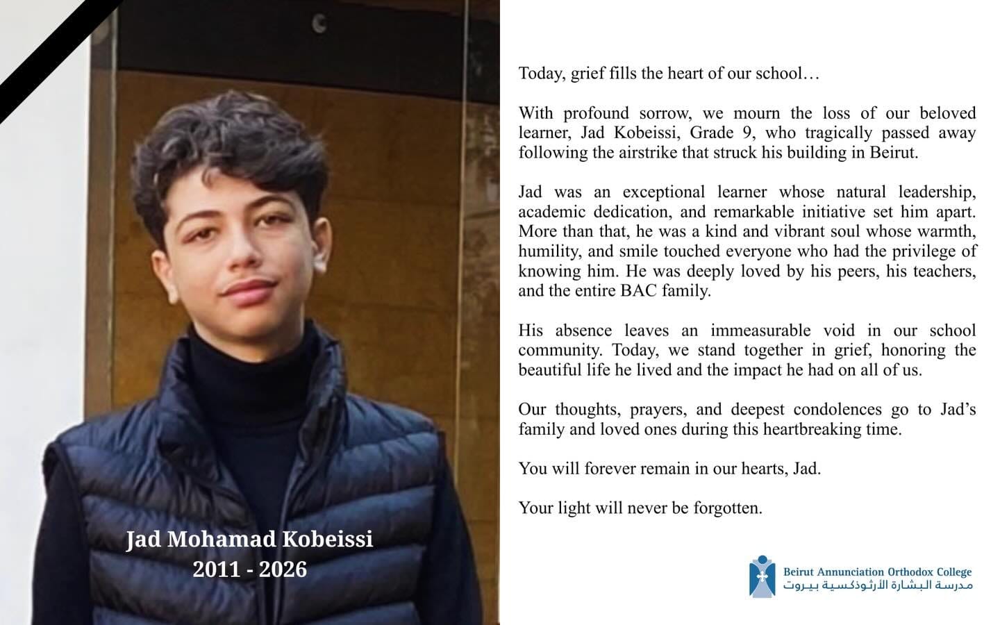 نعت مدرسة البشارة الأرثوذكسية -بيروت تلميذها الشهيد جاد قبيسي الذي ارتقى جراء الغارة على زقاق البلاط.
