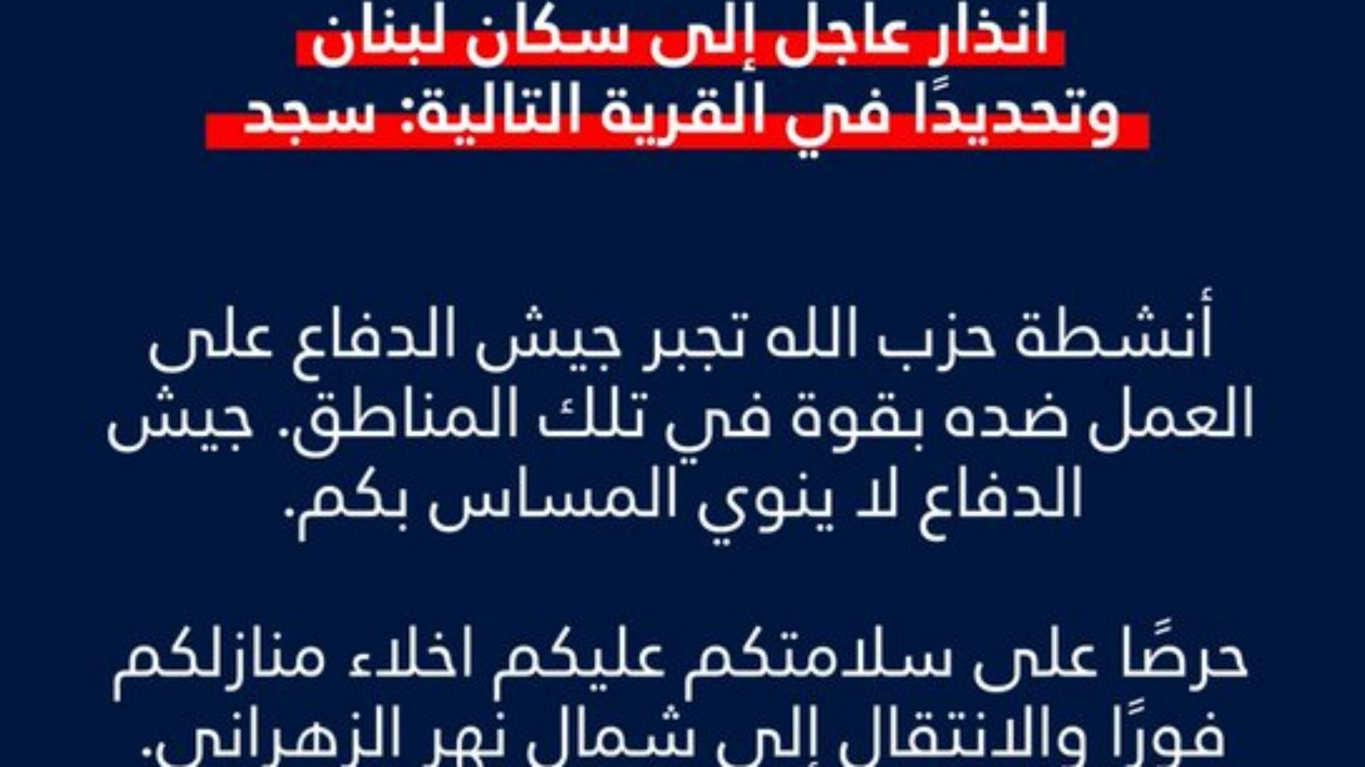 أنذر المتحدث باسم الجيش الإسرائيلي أفيخاي أدرعي سكان لبنان وتحديدًا سكان قرية سجد في جنوب لبنان.