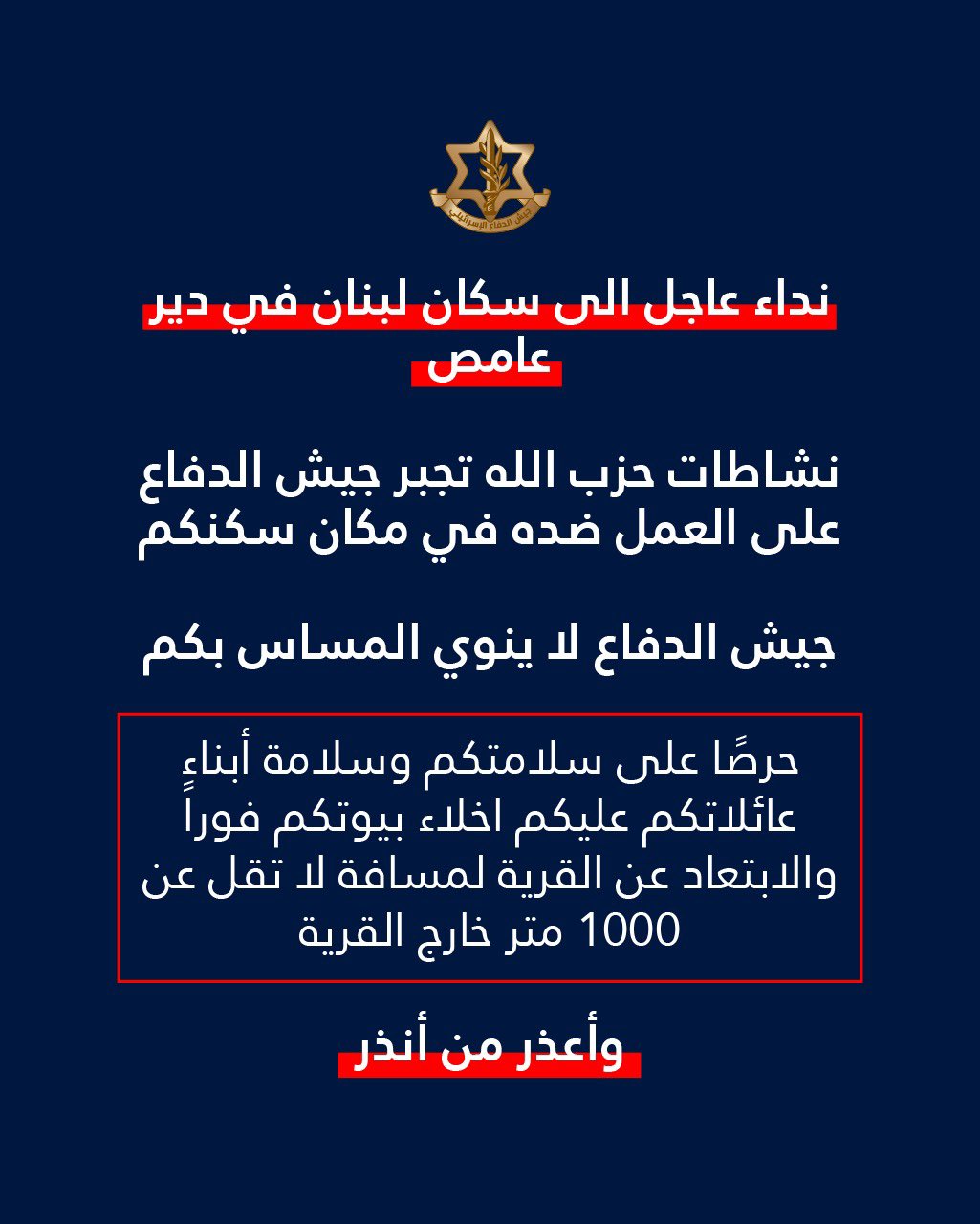 The Israeli army issues a warning to the residents of the town of Deir Ams