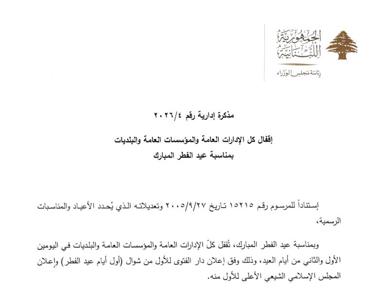 أصدرت رئاسة مجلس الوزراء مذكرين إداريتين تقضيان بإقفال كل الإدارات العامة والمؤسسات العامة والبلديات لمناسبة عيد الفطر المبارك وعيد بشارة السيدة مريم.