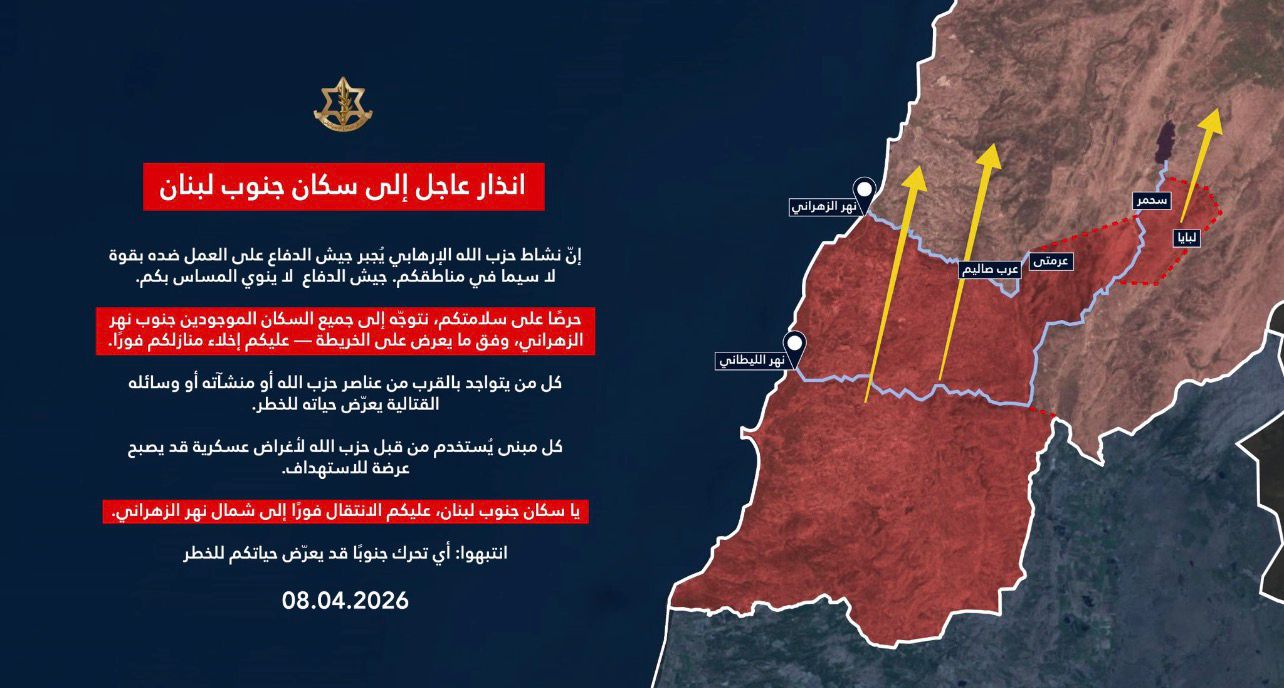 الجيش الإسرائيلي ينذر سكان جنوب لبنان المتواجدين جنوب نهر الزهراني